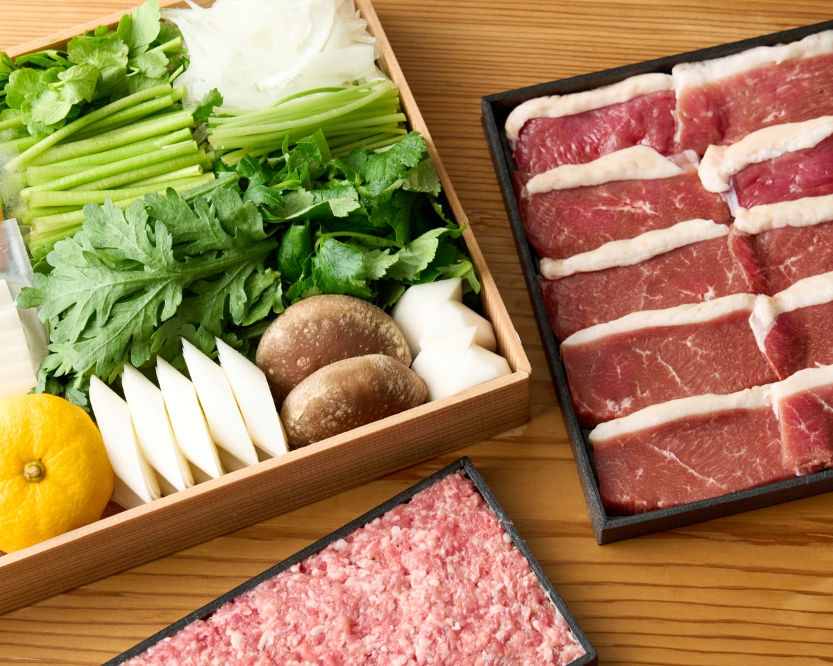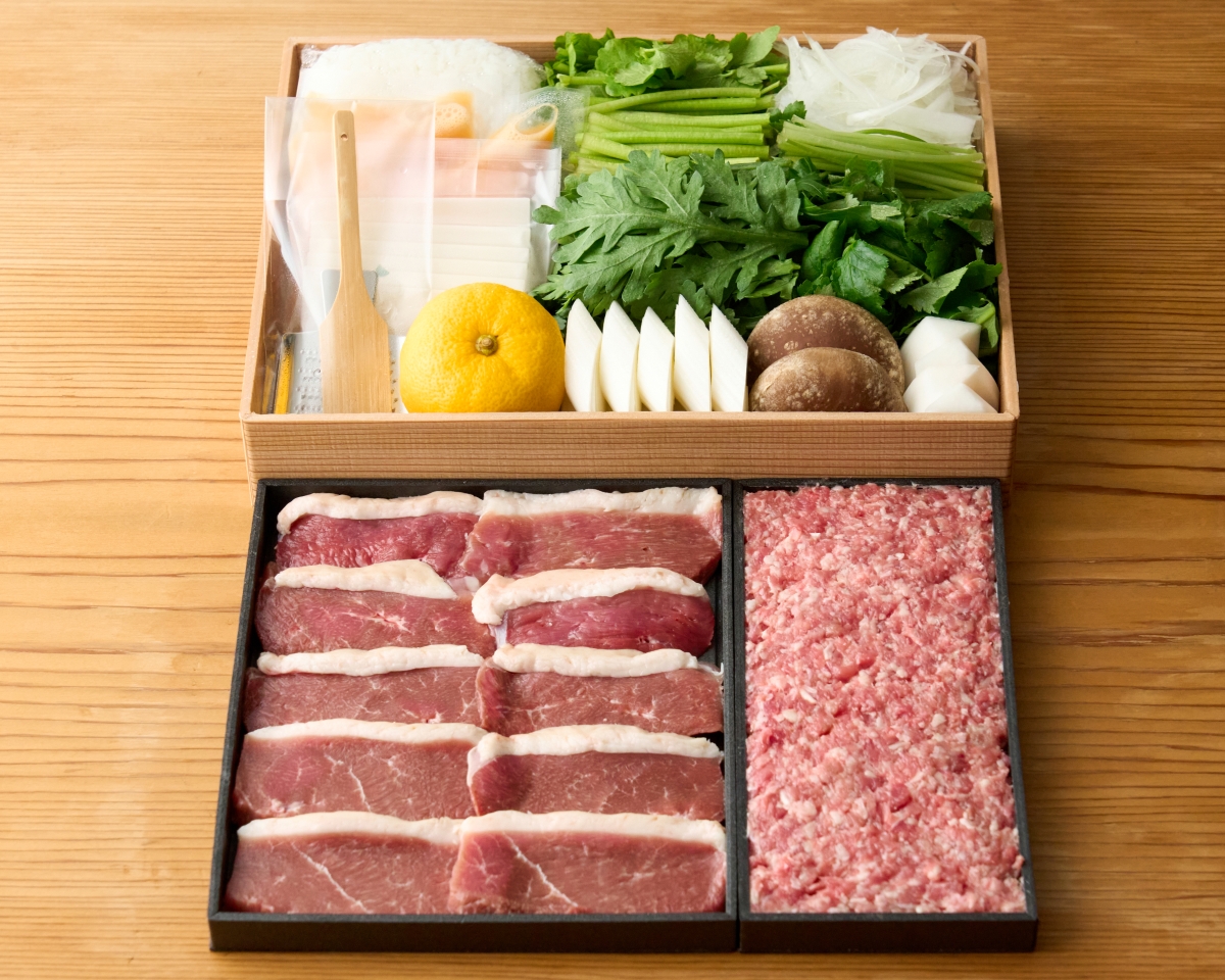 芹、三つ葉、春菊、壬生菜、蕪、椎茸、千寿葱、柚子、白飯、卵、葛切り、振り柚子セット、餅