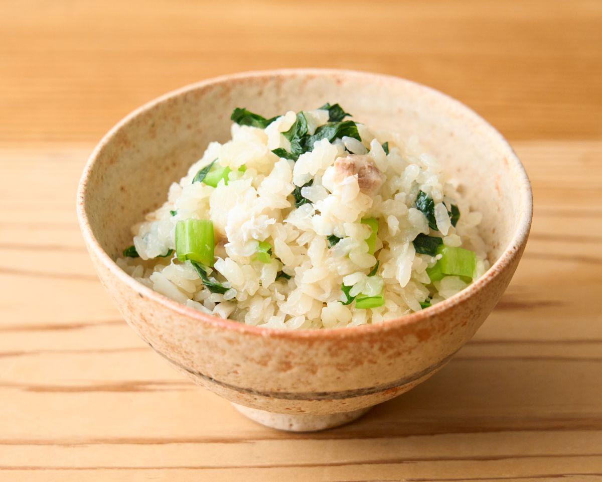 脂の乗った天然鯛をさっと酒蒸しで仕上げ、食感良く浅漬けにした刻み青菜のごはんです。