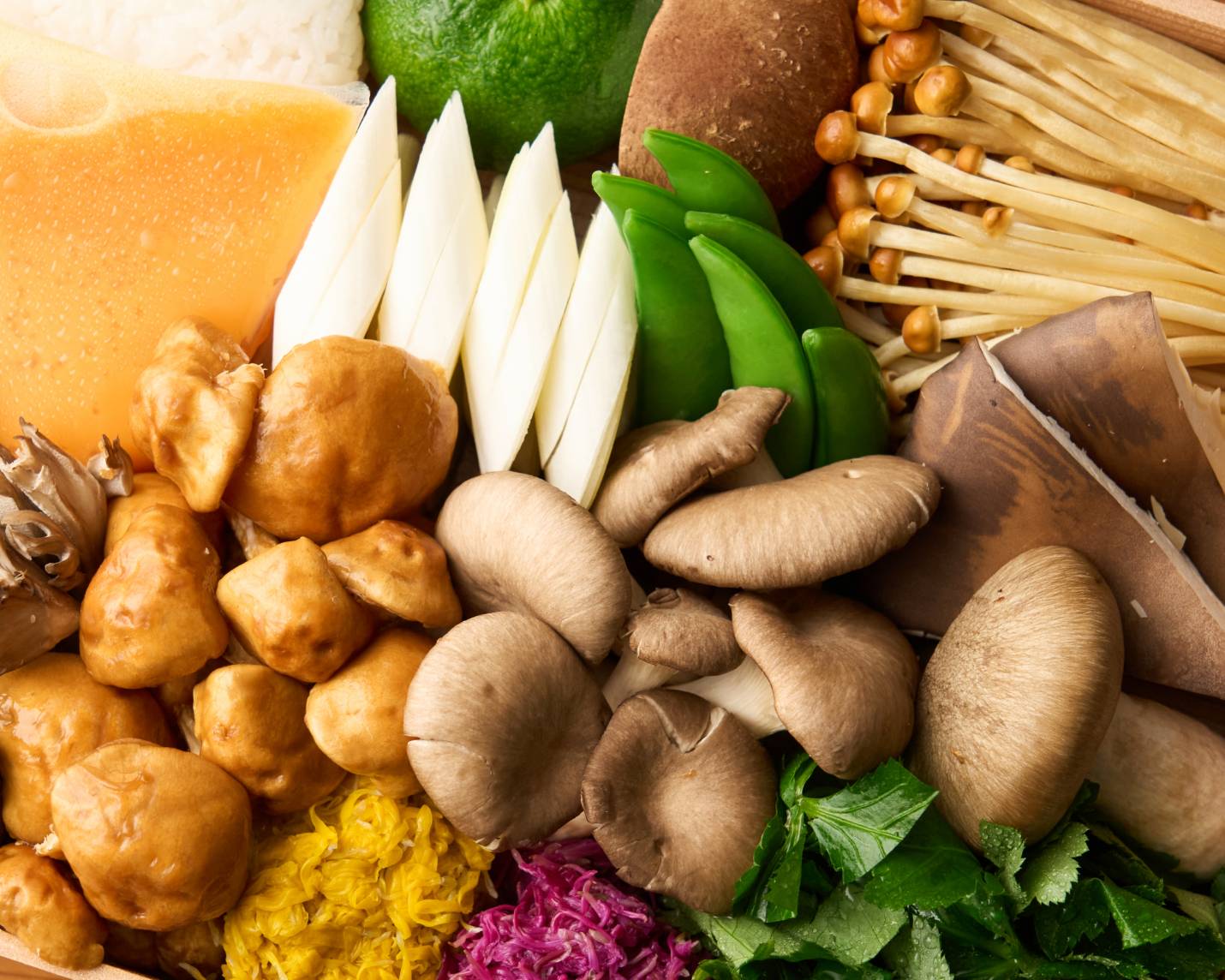 甘鯛、蛤、牛、椎茸、鮑茸、山えのき、蕪付き大なめこ、大国占地、舞茸、三つ葉、平茸、葱、スナップエンドウ、菊花、葛切り、白飯、卵、酢醤油、出汁