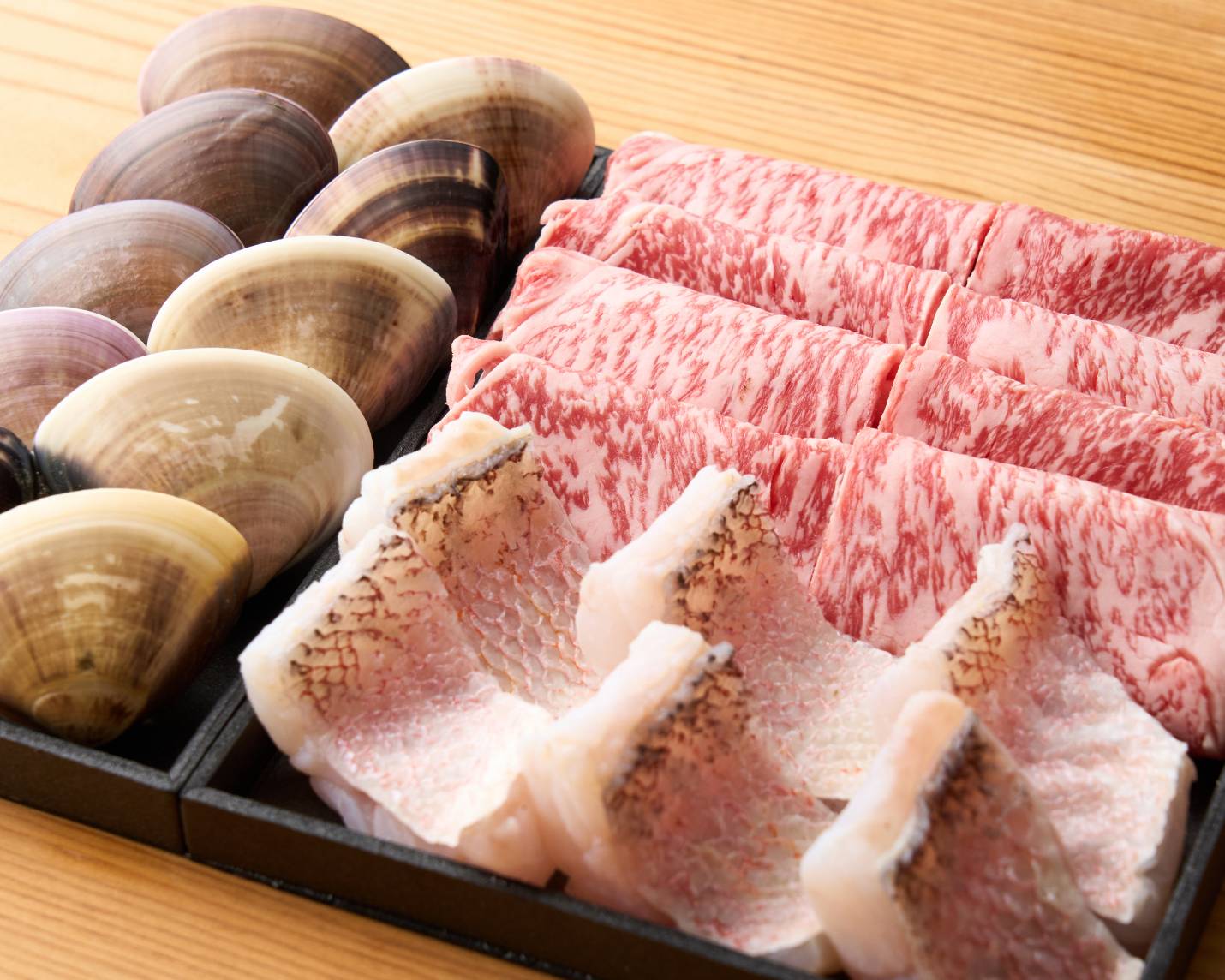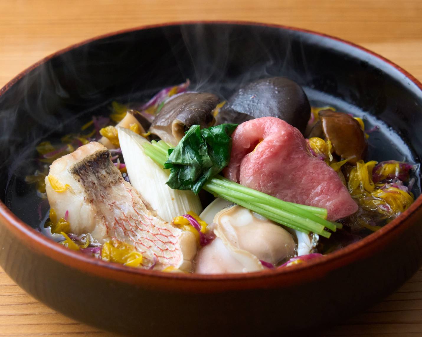 菊花を浮かべた石かわと虎白の極上出汁、豊後牛と甘鯛、蛤と秋の野菜を贅沢に盛り合わせたお鍋です。