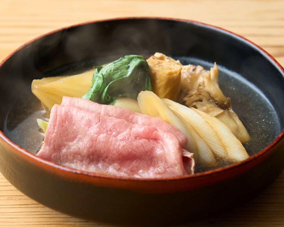 焼豆腐や巻き湯葉はじっくりと味を吸わせてから、さっと出汁にくぐらせて火の入る香りや食感の良い野菜は、牛で巻いて。
