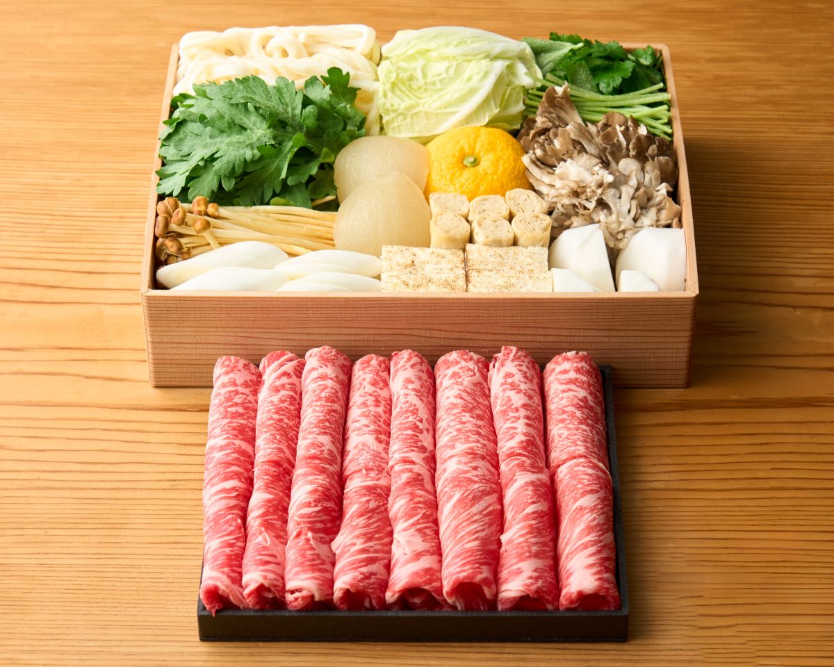 豊後牛、玉葱、白葱、三つ葉、春菊、白菜、舞茸、榎木茸、豆腐、生姜、湯葉、葛切り、うどん、柚子、出汁(鰹、昆布)
